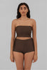 A versatile tankini top featuring a sleek single detachable strap and rouched side seams. A multi-functional design that can be worn in and out of the water as a classic boob tube, sleek halter, or minimal bandeau.